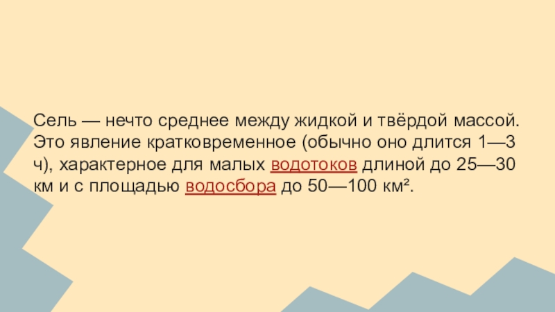 Сель — нечто среднее между жидкой и твёрдой массой. Это явление кратковременное (обычно оно длится 1—3 ч),