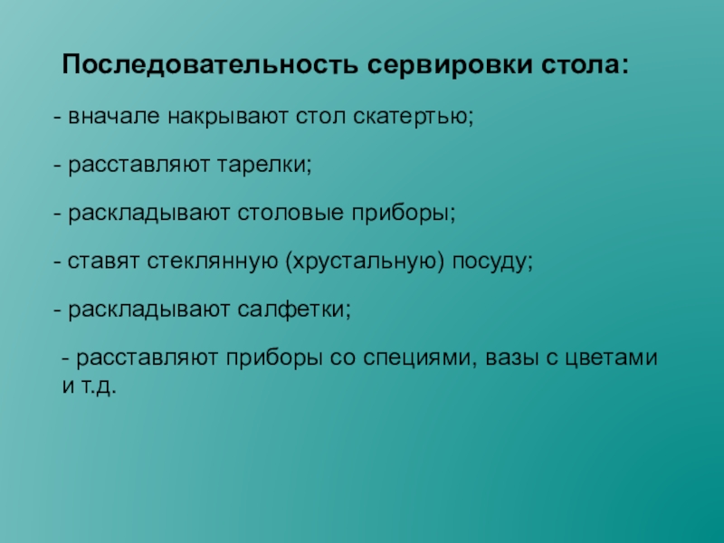Последовательность сервировки стола: вначале накрывают стол скатертью; расставляют тарелки; раскладывают столовые приборы; ставят стеклянную (хрустальную) посуду; раскладывают