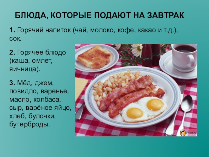 БЛЮДА, КОТОРЫЕ ПОДАЮТ НА ЗАВТРАК1. Горячий напиток (чай, молоко, кофе, какао и т.д.), сок.2. Горячее блюдо