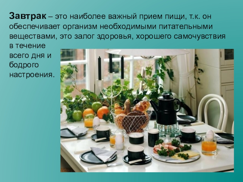 Слайд 13Завтрак – это наиболее важный прием пищи, т.к. он обеспечивает организм