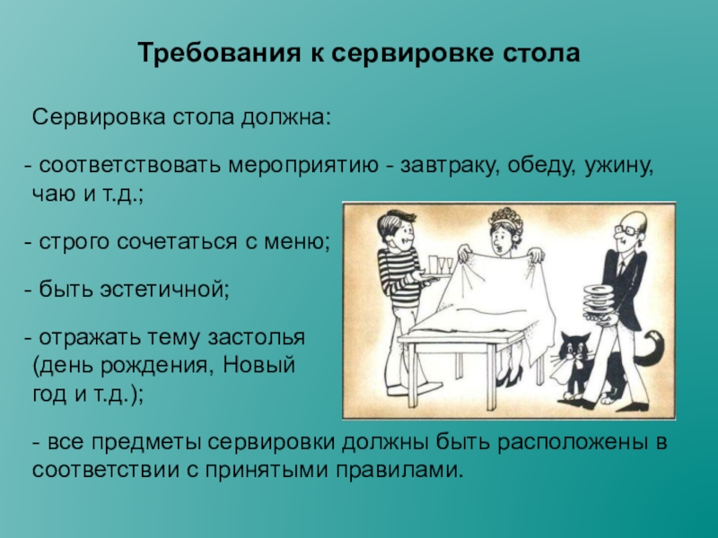 Требования к сервировке столаСервировка стола должна: соответствовать мероприятию - завтраку, обеду, ужину, чаю и т.д.; строго сочетаться