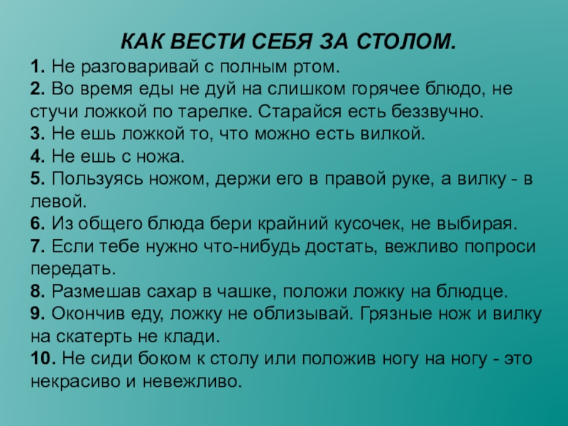 КАК ВЕСТИ СЕБЯ ЗА СТОЛОМ.1. Не разговаривай с полным ртом. 2. Во время еды не дуй на