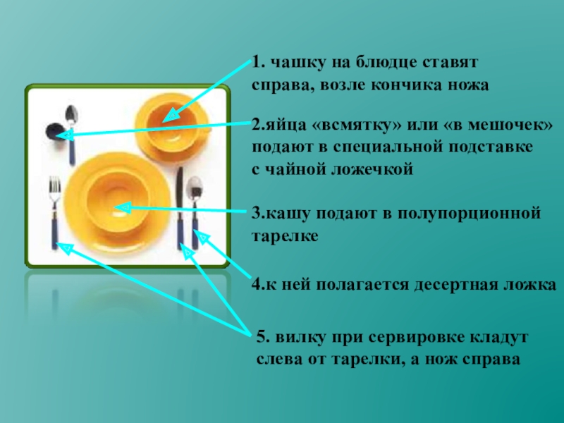 1. чашку на блюдце ставят справа, возле кончика ножа2.яйца «всмятку» или «в мешочек» подают в специальной подставке