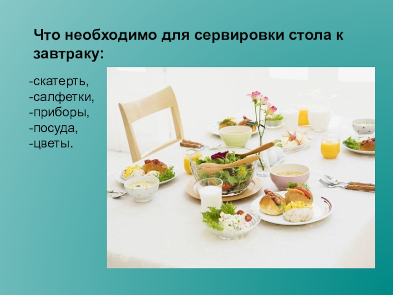 Слайд 6Что необходимо для сервировки стола к завтраку: