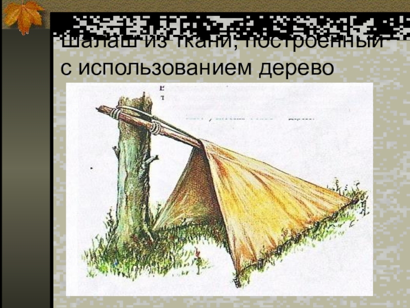 Слайд 19Шалаш из ткани, построенный с использованием дерево