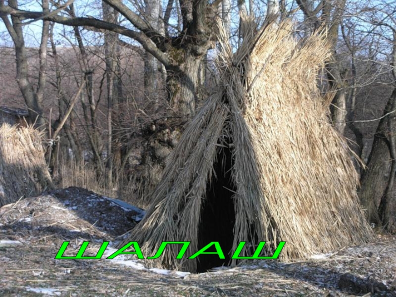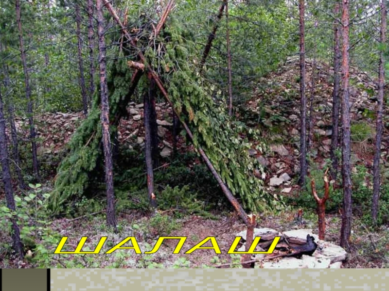 Слайд 10Наиболее просты в изготовлении шалаши в виде пирамиды. Чаще всего они