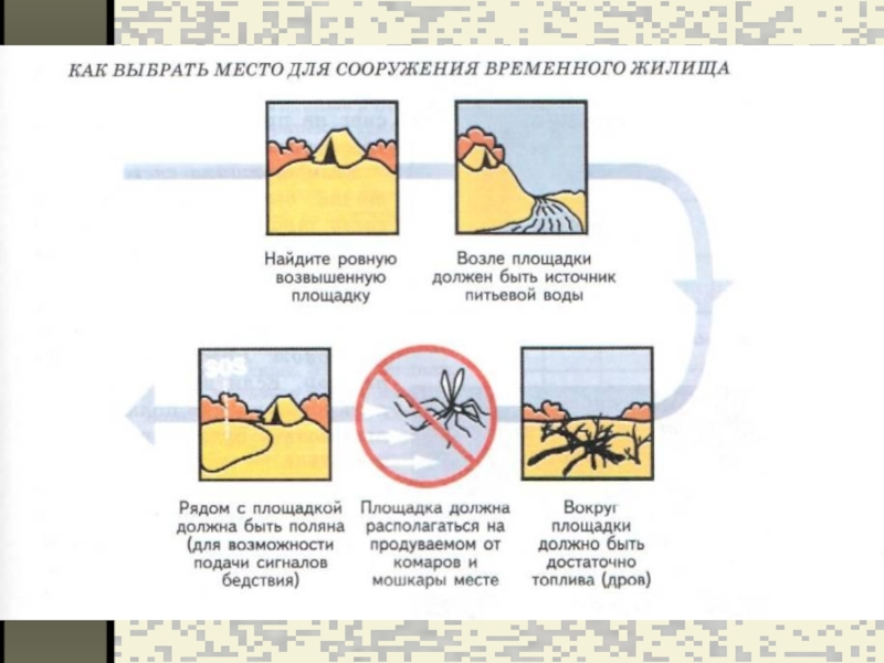 — защититься от дождя и снега, холода и жары, насекомых и пр. На выбор типа укрытия влияют и другие важные факторы: наличие материалов для строительства, продолжительность предполагаемой стоянки, количество людей и др.