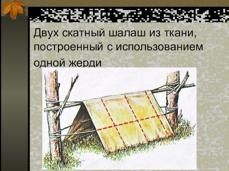 Слайд 15Двух скатный шалаш из ткани, построенный с использованием одной жерди