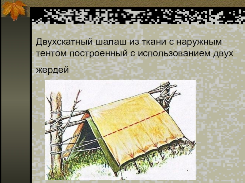 Слайд 16Двухскатный шалаш из ткани с наружным тентом построенный с использованием двух