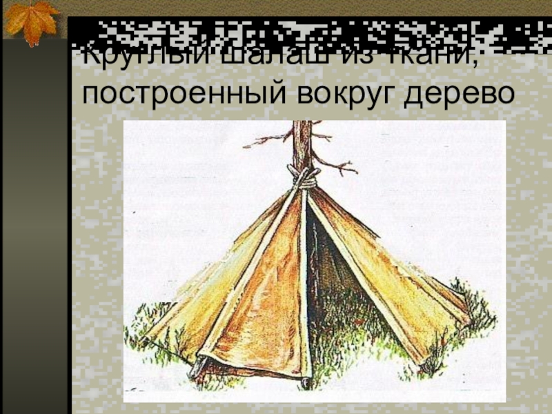 Слайд 18Круглый шалаш из ткани, построенный вокруг дерево
