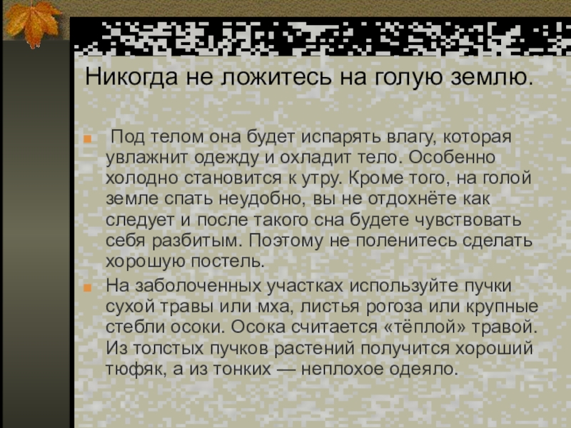 испарять влагу, которая увлажнит одежду и охладит тело. Особенно холодно становится к утру. Кроме того, на голой земле спать неудобно, вы не отдохнёте как следует и после такого сна будете чувствовать себя разбитым. Поэтому не поленитесь сделать хорошую постель.