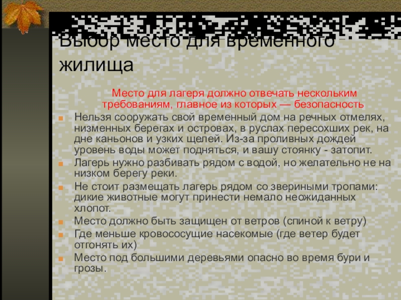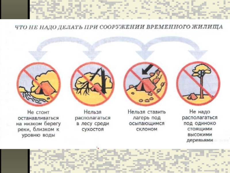Нельзя сооружать свой временный дом на речных отмелях, низменных берегах и островах, в руслах пересохших рек, на дне каньонов и узких щелей. Из-за проливных дождей уровень воды может подняться, и вашу стоянку - затопит.