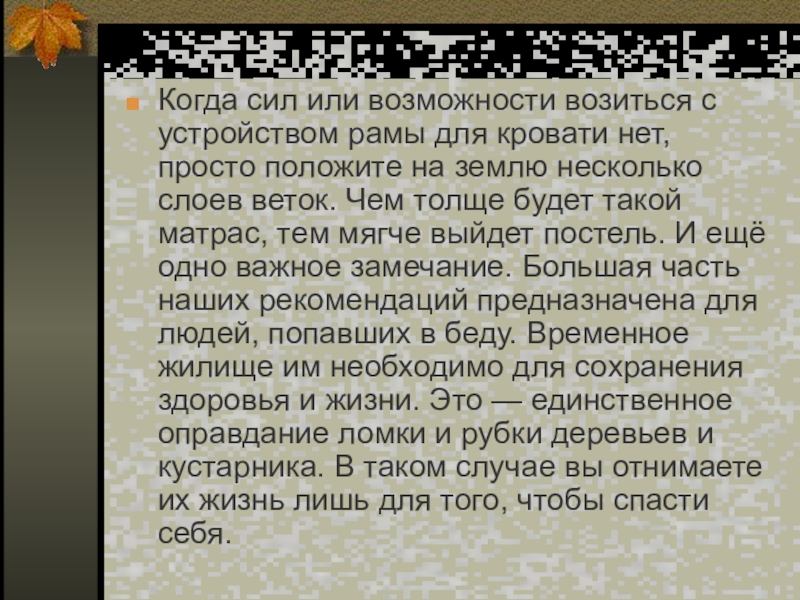 просто положите на землю несколько слоев веток. Чем толще будет такой матрас, тем мягче выйдет постель. И ещё одно важное замечание. Большая часть наших рекомендаций предназначена для людей, попавших в беду. Временное жилище им необходимо для сохранения здоровья и жизни. Это — единственное оправдание ломки и рубки деревьев и кустарника. В таком случае вы отнимаете их жизнь лишь для того, чтобы спасти себя.