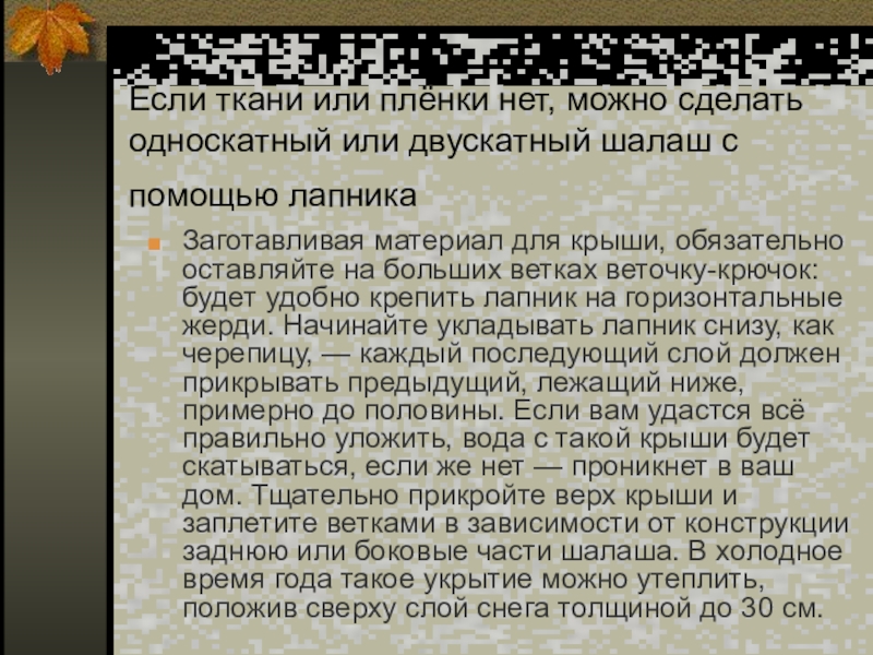 Слайд 21Если ткани или плёнки нет, можно сделать односкатный или двускатный шалаш