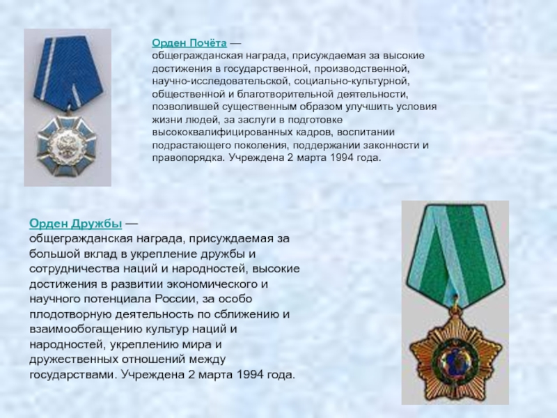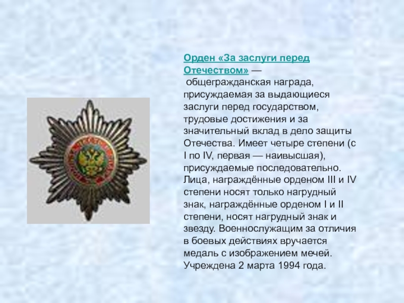 общегражданская награда, присуждаемая за конкретный вклад в развитие российской государственности, иную плодотворную деятельность, принесшую существенную пользу Отечеству. Учреждена 2 марта 1994 года