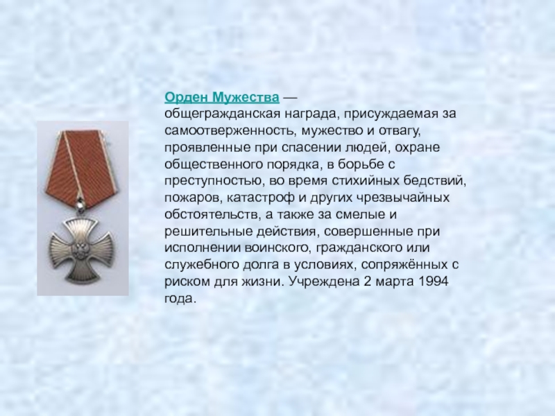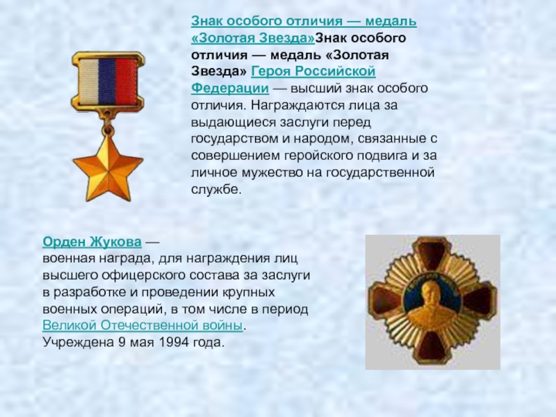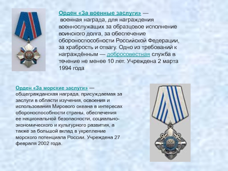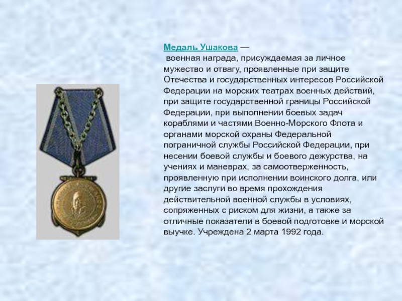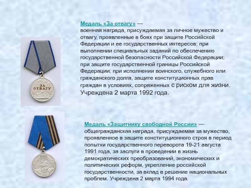 оенная награда, присуждаемая за личное мужество и отвагу, проявленные при защите Отечества и государственных интересов Российской Федерации в боевых действиях на суше, при несении боевой службы и боевого дежурства, на учениях и маневрах, при несении службы по охране государственной границы Российской Федерации, а также за отличные показатели в боевой подготовке и полевой выучке. Учреждена 2 марта 1994 года.
