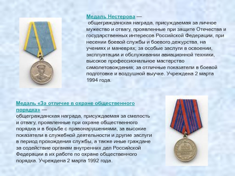 общегражданская награда, присуждаемая за смелость и отвагу, проявленные при охране общественного порядка и в борьбе с правонарушениями, за высокие показатели в служебной деятельности и другие заслуги в период прохождения службы, а также иные граждане за содействие органам внутренних дел Российской Федерации в их работе по охране общественного порядка. Учреждена 2 марта 1992 года.