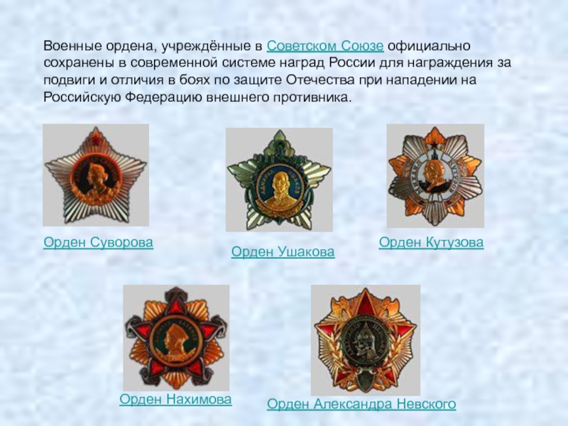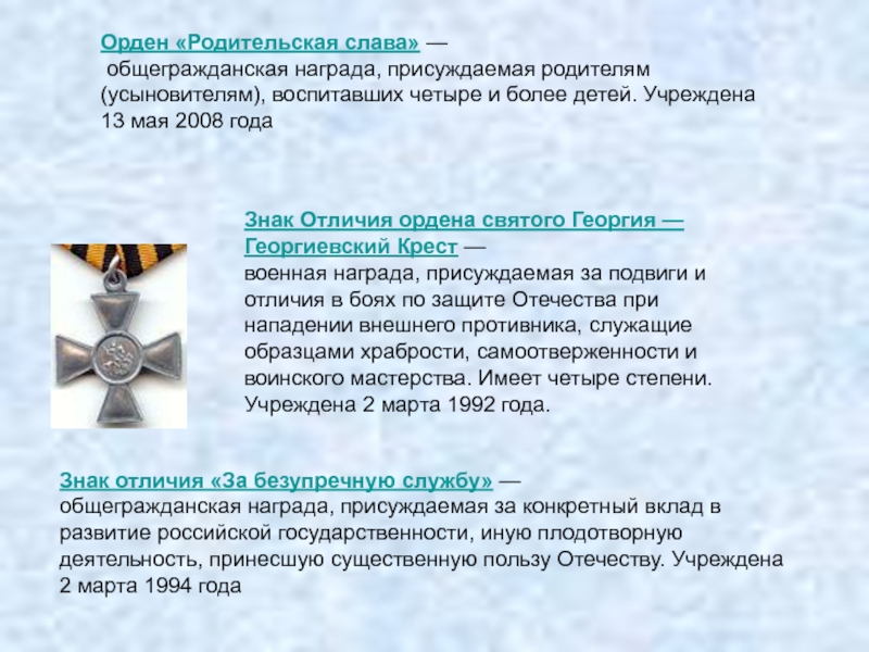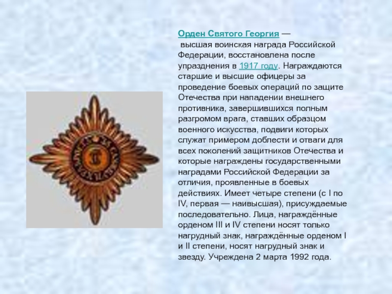 военная награда, присуждаемая за подвиги и отличия в боях по защите Отечества при нападении внешнего противника, служащие образцами храбрости, самоотверженности и воинского мастерства. Имеет четыре степени. Учреждена 2 марта 1992 года.