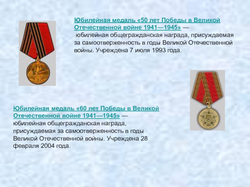 юбилейная общегражданская награда, присуждаемая за самоотверженность в годы Великой Отечественной войны. Учреждена 28 февраля 2004 года.