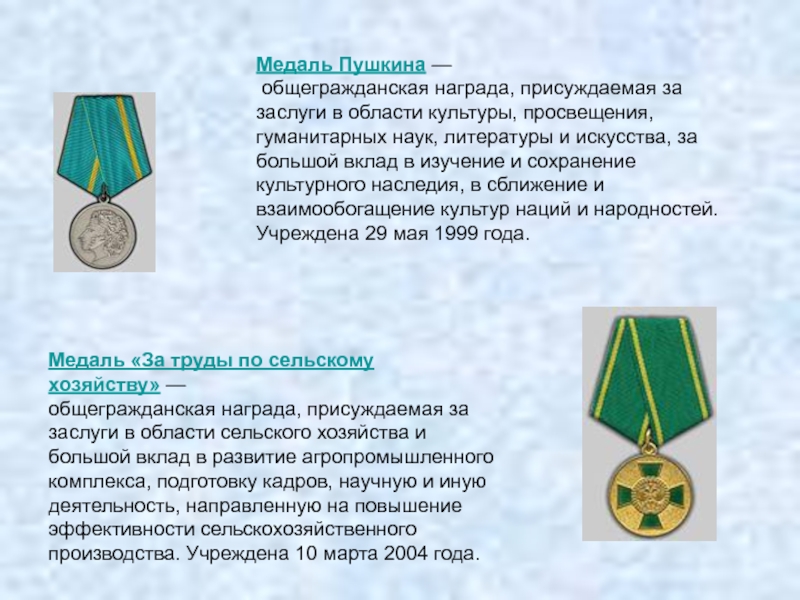 общегражданская награда, присуждаемая за заслуги в области сельского хозяйства и большой вклад в развитие агропромышленного комплекса, подготовку кадров, научную и иную деятельность, направленную на повышение эффективности сельскохозяйственного производства. Учреждена 10 марта 2004 года.