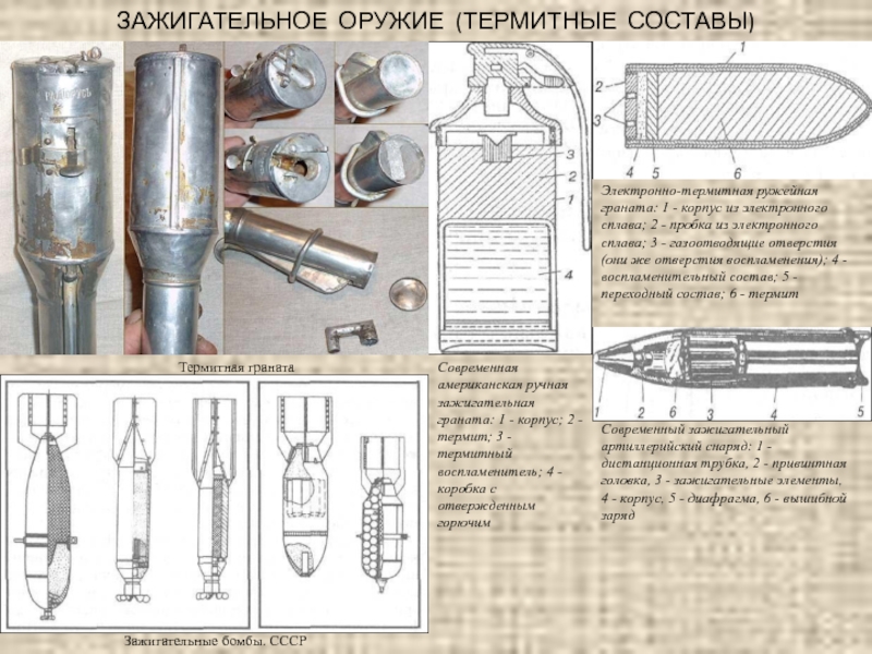 Современный зажигательный артиллерийский снаряд: 1 - дистанционная трубка, 2 - привинтная головка, 3 - зажигательные элементы,