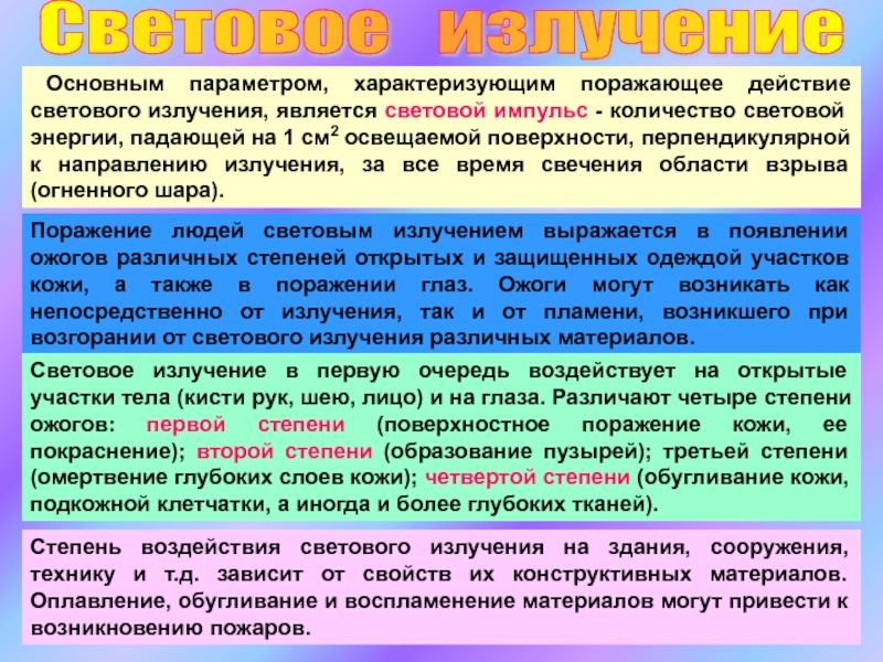 Световое излучение в первую очередь воздействует на открытые участки тела (кисти рук, шею, лицо) и на глаза. Различают четыре степени ожогов: первой степени (поверхностное поражение кожи, ее покраснение); второй степени (образование пузырей); третьей степени (омертвение глубоких слоев кожи); четвертой степени (обугливание кожи, подкожной клетчатки, а иногда и более глубоких тканей).