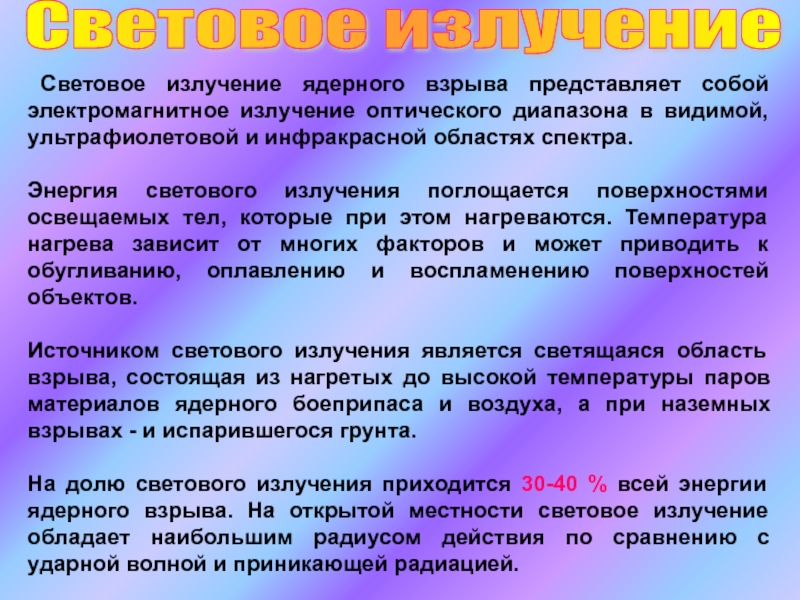 Степень воздействия светового излучения на здания, сооружения, технику и т.д. зависит от свойств их конструктивных материалов. Оплавление, обугливание и воспламенение материалов могут привести к возникновению пожаров.