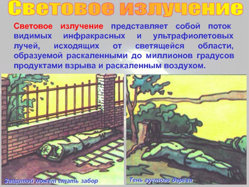 Поражение людей световым излучением выражается в появлении ожогов различных степеней открытых и защищенных одеждой участков кожи, а также в поражении глаз. Ожоги могут возникать как непосредственно от излучения, так и от пламени, возникшего при возгорании от светового излучения различных материалов.