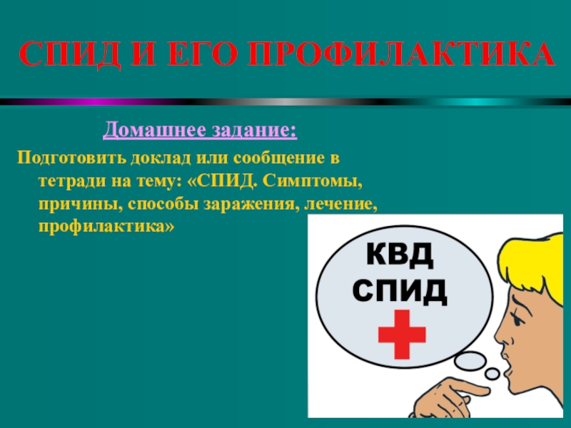 СПИД И ЕГО ПРОФИЛАКТИКАДомашнее задание:Подготовить доклад или сообщение в тетради на тему: «СПИД. Симптомы, причины, способы заражения,