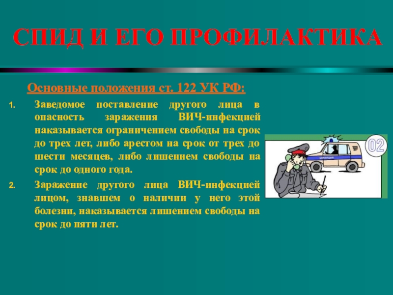 СПИД И ЕГО ПРОФИЛАКТИКАОсновные положения ст. 122 УК РФ:Заведомое поставление другого лица в опасность заражения ВИЧ-инфекцией наказывается