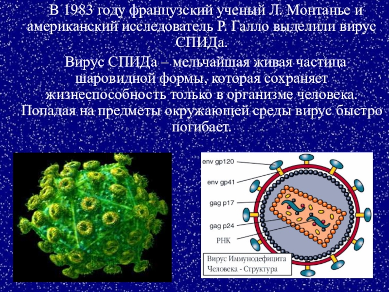 Вирус СПИДа – мельчайшая живая частица шаровидной формы, которая сохраняет жизнеспособность только в организме человека. Попадая на предметы окружающей среды вирус быстро погибает.
