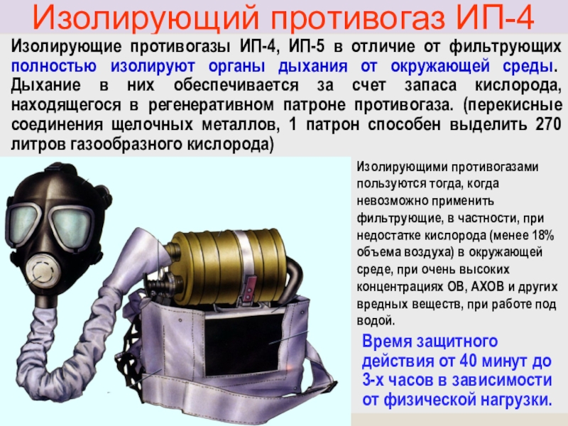 Изолирующими противогазами пользуются тогда, когда невозможно применить фильтрующие, в частности, при недостатке кислорода (менее 18% объема воздуха) в окружающей среде, при очень высоких концентрациях ОВ, АХОВ и других вредных веществ, при работе под водой.