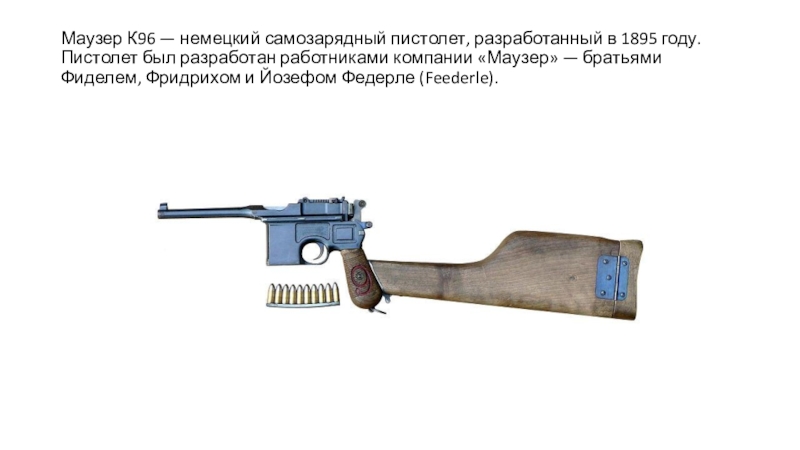 Слайд 3Маузер К96 — немецкий самозарядный пистолет, разработанный в 1895 году. Пистолет