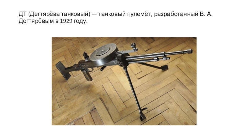 Слайд 18ДТ (Дегтярёва танковый) — танковый пулемёт, разработанный В. А. Дегтярёвым в