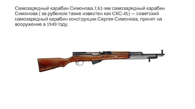 Слайд 10Самозарядный карабин Симонова.7,62-мм самозарядный карабин Симонова ( за рубежом также известен