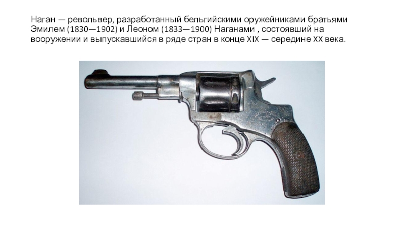 Слайд 2Наган — револьвер, разработанный бельгийскими оружейниками братьями Эмилем (1830—1902) и Леоном