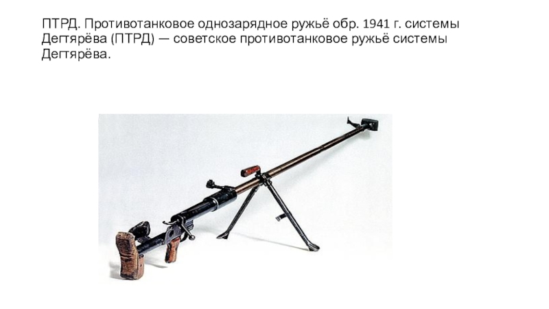 Слайд 22ПТРД. Противотанковое однозарядное ружьё обр. 1941 г. системы Дегтярёва (ПТРД) —