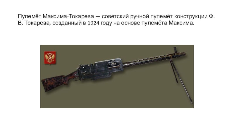 Слайд 16Пулемёт Максима-Токарева — советский ручной пулемёт конструкции Ф. В. Токарева, созданный