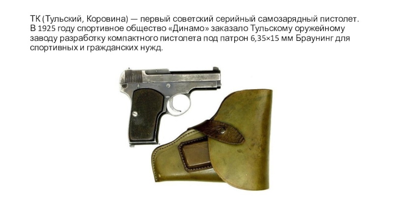 Слайд 4ТК (Тульский, Коровина) — первый советский серийный самозарядный пистолет. В 1925