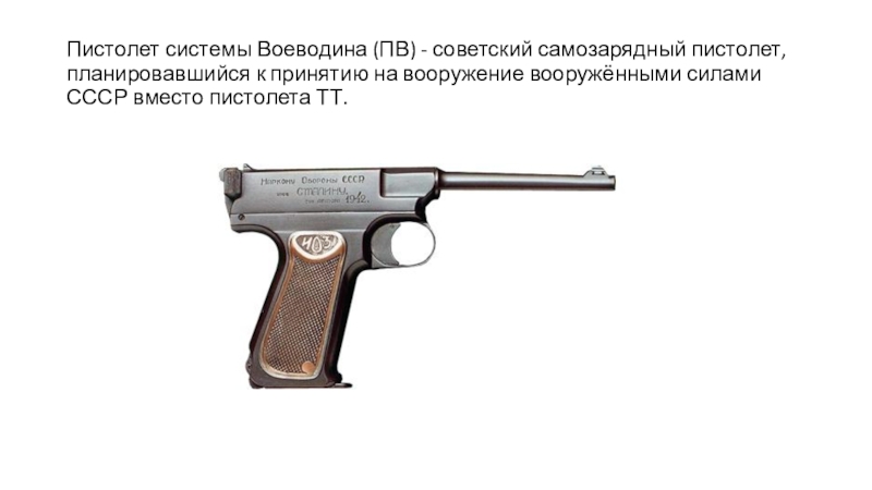 Слайд 6Пистолет системы Воеводина (ПВ) - советский самозарядный пистолет, планировавшийся к принятию