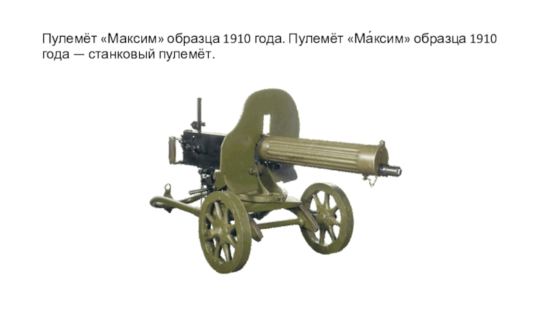 Слайд 15Пулемёт «Максим» образца 1910 года. Пулемёт «Ма́ксим» образца 1910 года —