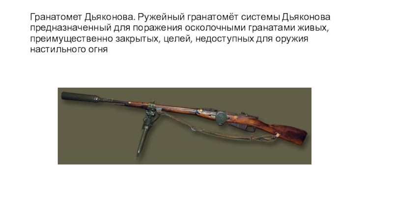 Слайд 24Гранатомет Дьяконова. Ружейный гранатомёт системы Дьяконова предназначенный для поражения осколочными гранатами