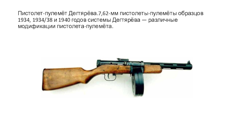Слайд 12Пистолет-пулемёт Дегтярёва.7,62-мм пистолеты-пулемёты образцов 1934, 1934/38 и 1940 годов системы Дегтярёва