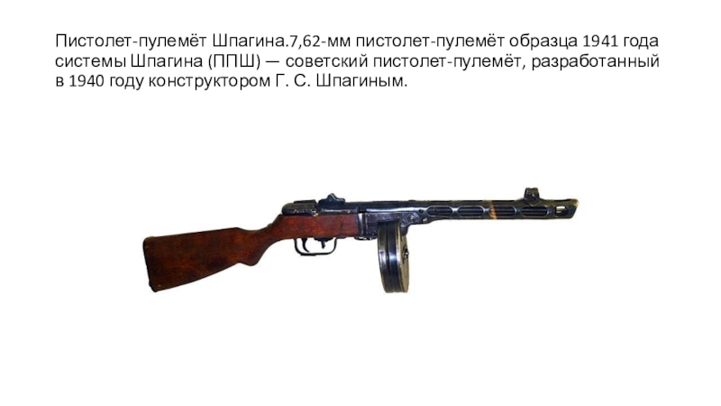 Слайд 13Пистолет-пулемёт Шпагина.7,62-мм пистолет-пулемёт образца 1941 года системы Шпагина (ППШ) — советский