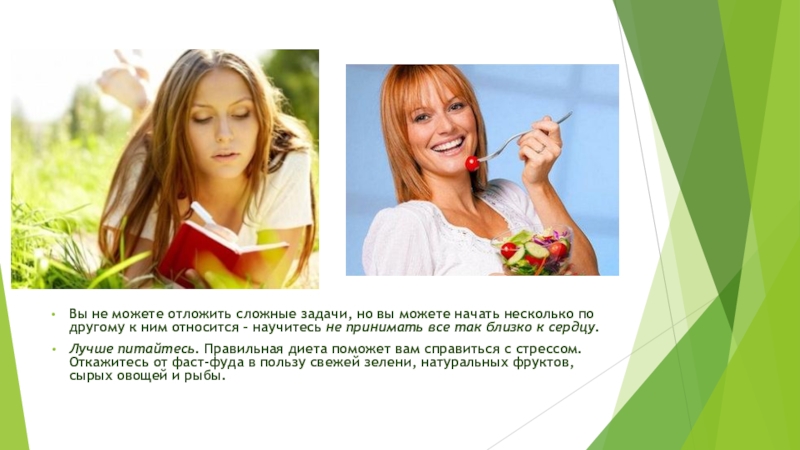 Лучше питайтесь. Правильная диета поможет вам справиться с стрессом. Откажитесь от фаст-фуда в пользу свежей зелени, натуральных фруктов, сырых овощей и рыбы.