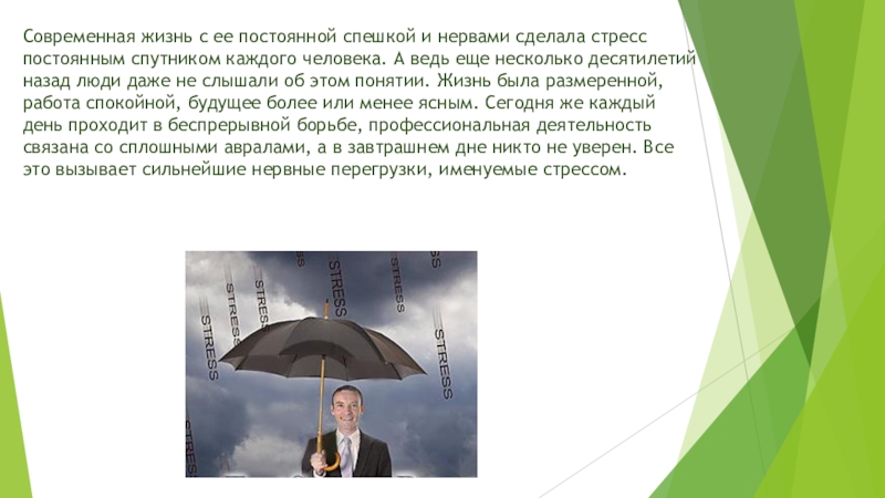 Слайд 2Современная жизнь с ее постоянной спешкой и нервами сделала стресс постоянным