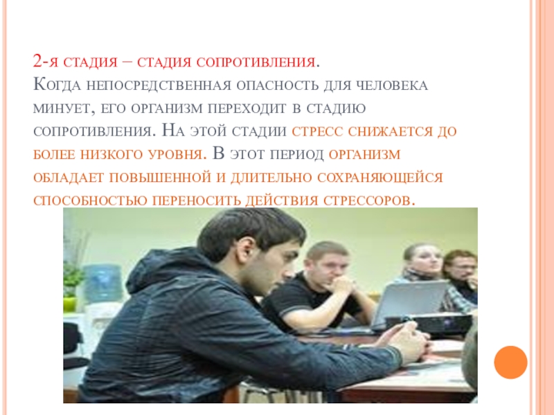 организм переходит в стадию сопротивления. На этой стадии стресс снижается до более низкого уровня. В этот период организм обладает повышенной и длительно сохраняющейся способностью переносить действия стрессоров.