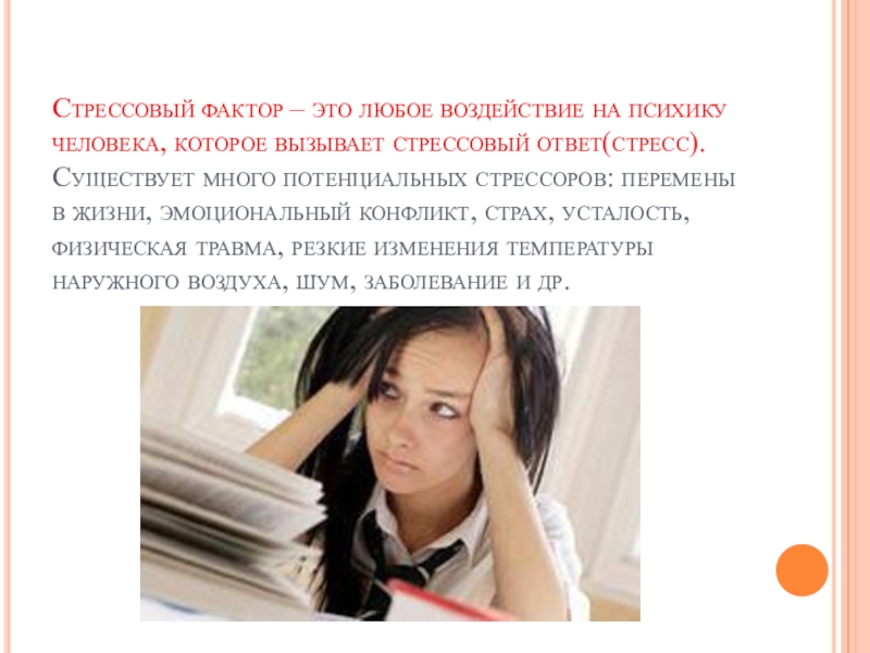 Слайд 5Стрессовый фактор – это любое воздействие на психику человека, которое вызывает