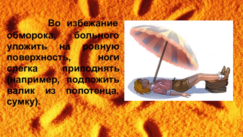 Слайд 7 Во избежание обморока, больного уложить на ровную поверхность,