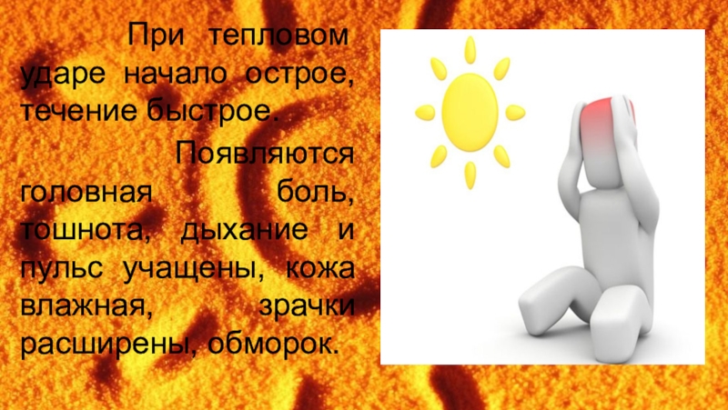 Слайд 14 При тепловом ударе начало острое, течение быстрое.